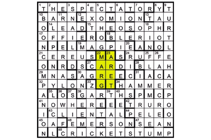 The name was Margaret, whose various versions are suggested by THE SPECTATOR (1: Mag), BARN OWL (10/36: Madge), LEAD HAMMER (14/34: Madge), MAGPIE (19A: Madge or Maggie), CRICKET STUMP (48: Peg), HALFPENNY (2: Mag or Meg), TURTLE HARPOON (9: Peg), PIN (16: Peg) and TEASE (Mag). MARGARET (22/23) was to be shaded. Title: cf. pearl, the meaning of Margaret.