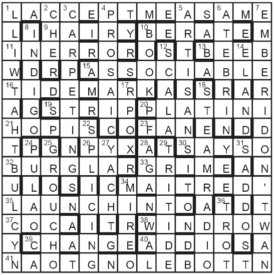 The perimeter quotation reads, ‘I don’t want to belong to any club that will accept me as a member’. The unclued lights STRIP, FAN, BOOK, GROUCHO and YACHT can all be followed by the word ‘club’; GROUCHO Marx is the source of the quotation, which is from his resignation letter to a Hollywood club.