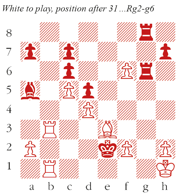 32 R3b2+ Kf3 33 Rb3 Ke2 34 R1b2+? 34 f7 still wins. Kf1 35 Rb1+ Be1 What follows is hopeless for White, but there is no good answer to the threat of mate on g1. 36 Rxe1+ Kxe1 37 Rb1+ Ke2 38 Bf4 Rxf6 39 Bg3 Kd3 40 Rb4 Rg4 41 Rb7 Rf7 42 f4 h5 43 Kg2 h4 44 Kf3 hxg3 45 Kxg4 g2 White resigns