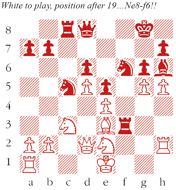 1 d4 Nf6 2 c4 g6 3 Nc3 Bg7 4 e4 O-O 5 Be3 d6 6 h3 e5 7 d5 Na6 8 g4 Nc5 9 f3 c6 10 Qd2 cxd5 11 cxd5 Ne8 12 h4 f5 13 g5 fxe4 14 fxe4 Bg4 15 Be2 Bxe2 16 Ngxe2 Rc8 17 h5 Rf3 18 Rh4 Bh6! A neat move as 19 gxh6? allows Qxh4+. Moreover, the threat is Rf3xe3 followed by Bh6xg5. 19 Rh2 Nf6!! (see diagram) An ingenious self-fork. Now 20 gxf6? Bxe3 wins, while 20 gxh6 Ng4 wins material, e.g. 21 Bg5 Nxh2 22 Bxd8? Rf1 mate. 20 Bxc5 Ng4! Yet another powerful shot: h2, c5 and g5 are all hanging. 21 gxh6 Nxh2 22 O-O-O Nf1 23 Qc2 Rxc5 Black’s material advantage is now decisive. 24 Qa4 a5 25 Kb1 g5 26 Nc1 b5 27 Nxb5 Qd7 28 Nc3 Rfxc3! A final tactical flourish. 29 Qxd7 Nd2+ 30 Rxd2 Rxc1 Mate