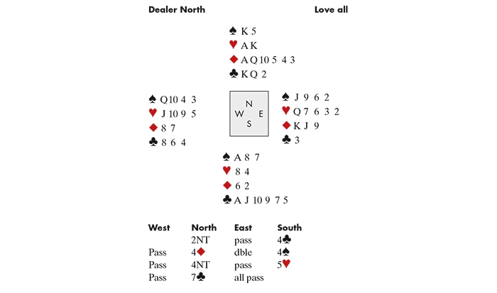 Maurice opened 2NT and I bid 4♣ — a slam try. He cue bid 4♦ (which could be an ace or a king) and East doubled. I contemplated passing to see whether Maurice would redouble to show first-round control (any other bid would deny it), but decided to bid 4♠ to show concern about hearts. After all, we could bid Blackwood to check for aces. Maurice did: I showed two, and he bid 7♣. West led a diamond — and I went the inevitable one down. ‘You knew the diamond finesse would be wrong, so why bid seven?’, I asked. But, as he and the experts in the room pointed out, I was mistaken. I hadn’t realised that the double had given me a chance to describe my own hand further, and that by bidding instead of passing, I had practically announced that I had a singleton (if I didn’t, we might be going down on a diamond lead had Maurice held the ♦K, not the ♦A). He had evaluated his hand accordingly: there were enough entries to dummy to ruff and establish diamonds. His bid was justified — and now I must win back his trust!