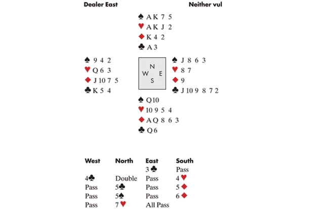 Weinstein and his regular partner Bobby Levin made life difficult for the opponents with some aggressive pre-emptive bidding. N-S did too much, but as you can see, the grand makes on a trump finesse. Or at least, it was going to make until Weinstein led… the ♥3! Declarer (Kitty Cooper), never believing he would lead away from the queen, understandably rose with the ♥A and cashed the ♥K. One down, and I think she still has nightmares.