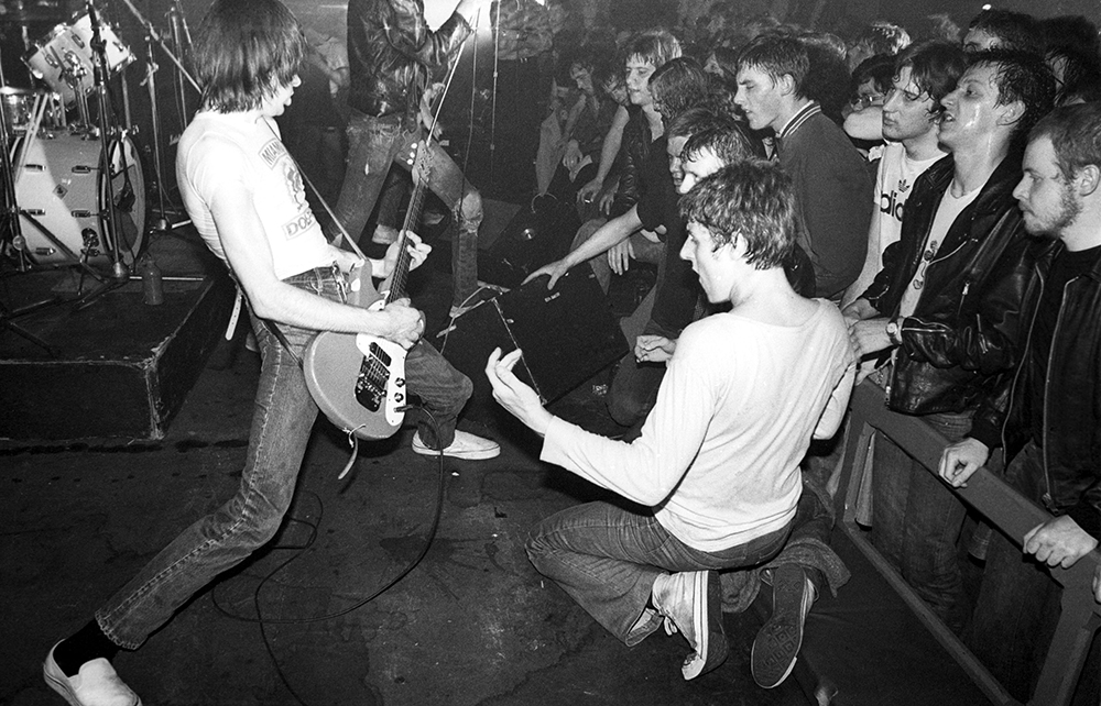 Punk fans crowd the stage as the Ramones perform at Eric’s Club, Liverpool, in May 1977. [Getty Images]