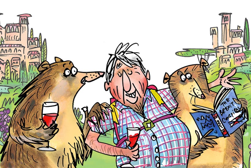 Yes. I noticed that in Kompromat the word he kept using about the Boris character was ‘ebullient’, which is obviously something he approves of. ‘Yes, broad sunlit uplands! I think ebullience is a pretty important attribute, OK? Now, looking at my own particular life, I have no reason not to be ebullient, because life has dealt me this fantastically brilliant hand. I was brought up on this wonderful farm on Exmoor, I’ve had two totally successful marriages, I have immense admiration for my first wife and immense love and loyalty for my second wife, I’m thrilled with all the kids, and my work involves doing exactly what I want to do — I travel round the world. So I feel that I have no right not to be ebullient.’