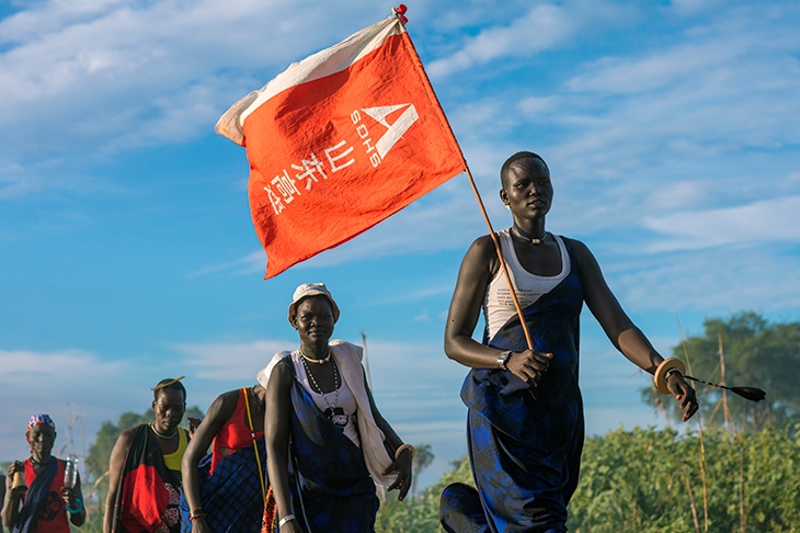 Mundari tribe women with a Chinese flag celebrate a wedding in South Sudan. Credit: Getty Images