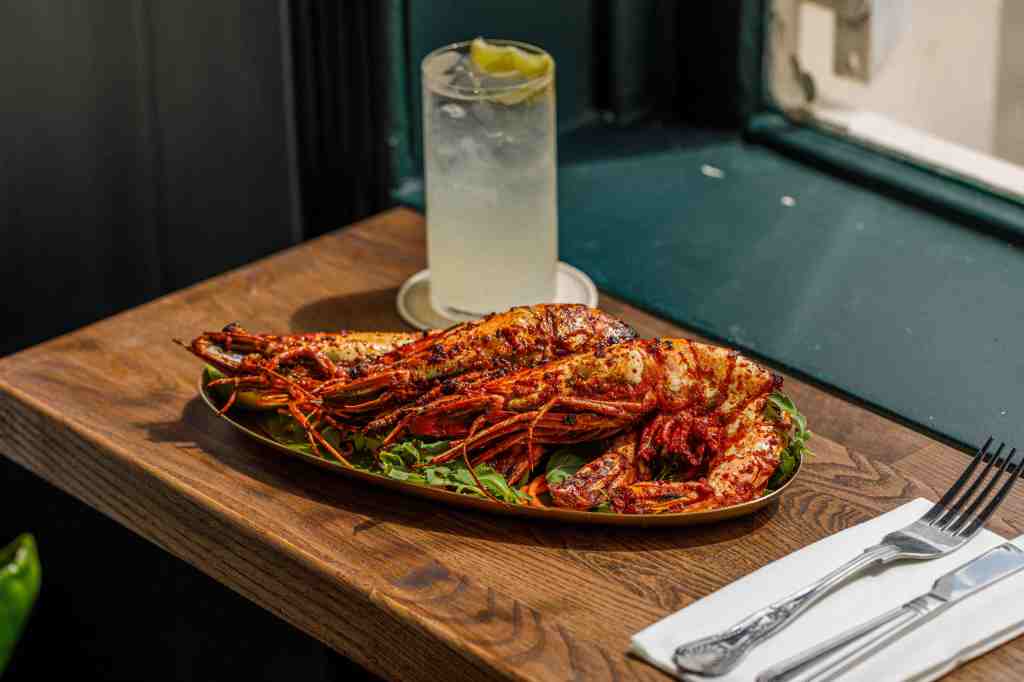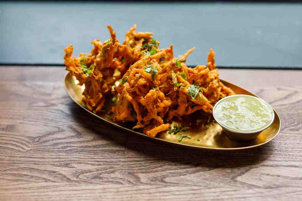 I ordered okra fries while perusing the menu and sipping an expertly made negroni. These crispy fingers had a crunch and tang that beat cheesy Wotsits any day. I toyed with the idea of the spiced chicken lollipops with various chutneys but had been told I must try the onion bhaji. Most I have eaten, anywhere from bog-standard curry houses through to Michelin-starred joints, are variations on soggy clumps that could be hiding a dead mouse. This one was a triumph, the tempura-light batter covering onion tentacles that spread out like a starfish across the gold oval platter on which it was served, nudging against a small pot of sharp mint and yoghurt sauce.