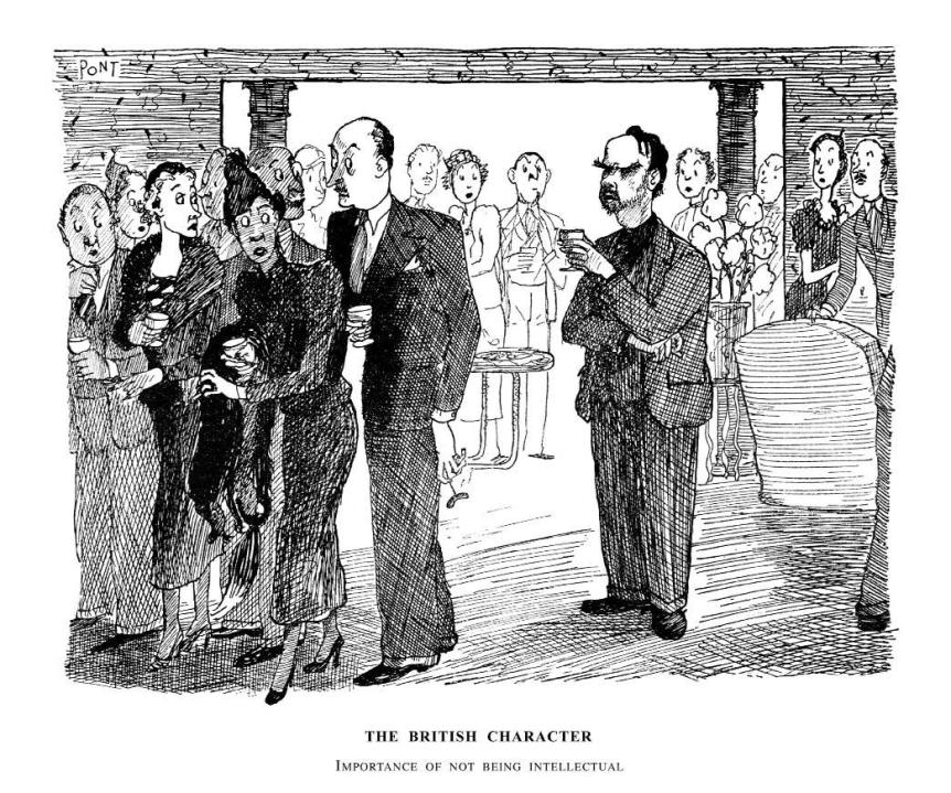 One of the advantages of working for the magazine was that it let you experiment and spread your wings. Nowadays nowhere allows you so much space to play about in; single-column cartoons rule, and if you can’t do them you’ve had it. But I’m very keen on drawings that show their period. Even if you don’t find everything in this collection funny, at least savour the great Pont (above, a 1937 drawing from his famous series ‘The British Character’, which ran in Punch from 1934 until his death in 1940) and the details of clothing, furniture, radios etc. of the time.