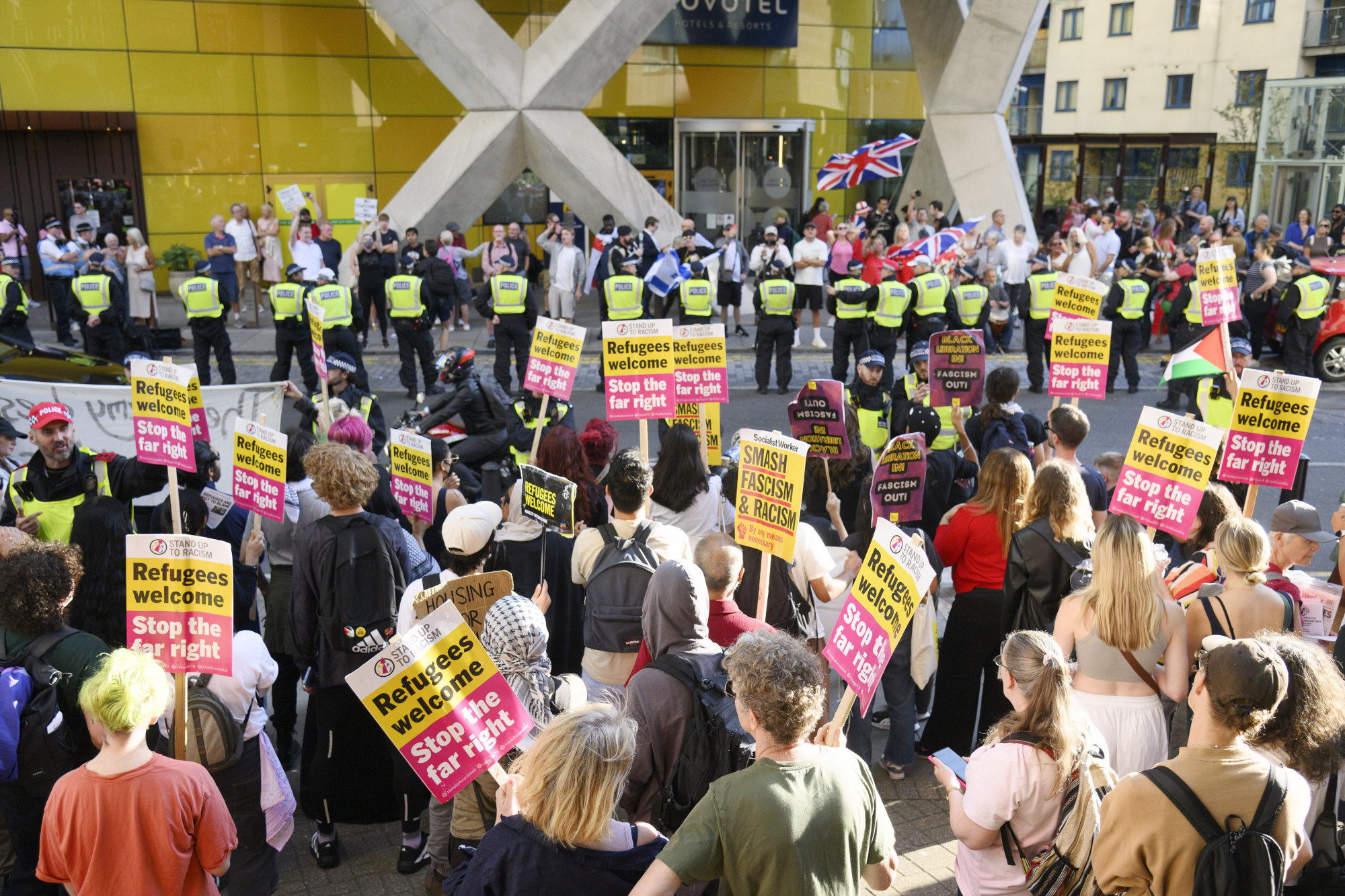 On Friday, counter-protestors affiliated with Stand Up to Racism arrive. They line up on the other side of the road, holding yellow and pink placards, shipped in by the organisers. Many are young women. Some have colourful hair and septum piercings, others wear Birkenstocks and keffiyehs. Even local resident Gary Stevenson, trader turned left-wing YouTuber, turns up to gawk at the protestors. I ask him what he thinks of the protest, he says I’ll have to speak to his agent. The police presence is heavy.