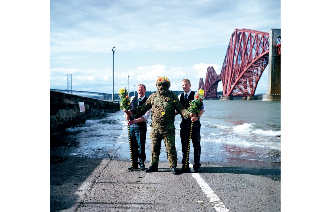 Among folk costumes, I find most impressive those that transform the human body into something unnameable. It is quite easily done. The Burry Man of South Queensferry, West Lothian, is annually covered with thousands of burdock burrs. His face is hidden. He cannot put his arms to his side or they’d be stuck as if by Velcro, so two attendants help him walk along for hours holding two tall sticks. To drink he must use a straw. Homer Sykes’s photograph of him accomplishing this in a pub in 1977 is now in the Government Art Collection.