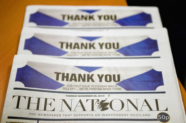 This week a new newspaper, the National, was launched to press the case for independence. It sold 50,000 copies of its first edition — almost twice what the Scotsman averages — and then doubled its print run. Copies of its launch issue were soon selling for £10 on eBay. Owned by the Herald group, it remains a shoestring operation for now — but its mere appearance is more significant than its quality. It is a reminder that the thirst for change in Scotland remains unquenched.