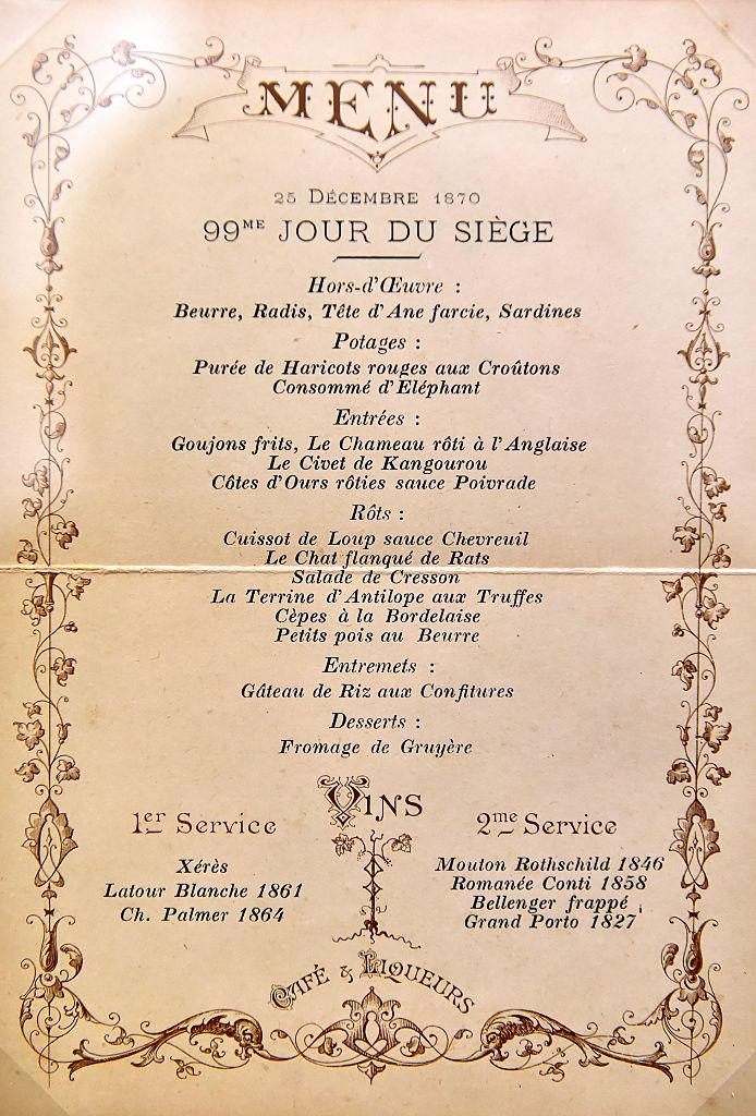 On Christmas Day 1870, the 99th day of the siege, Chef Choron opened the doors of Voisin and served a six-course menu to his upper-class clientele that included appetisers of stuffed donkey head and sardines, followed by a pureed red bean soup made with elephant stock. The main course was roasted camel, English-style kangaroo stew and bear chops roasted with a pepper sauce. Among the day’s roasts were haunch of wolf, cat flanked with rats and an antelope terrine with truffles, while those who didn’t fancy eating the zoo could dine on Bordeaux-style porcini mushrooms with buttered green peas. The feast was paired with fine wines, including Mouton Rothschild 1846, Château Palmer 1864 and Romanée-Conti 1858, all finished off with a very uninspired rice pudding and gruyere cheeseboard.