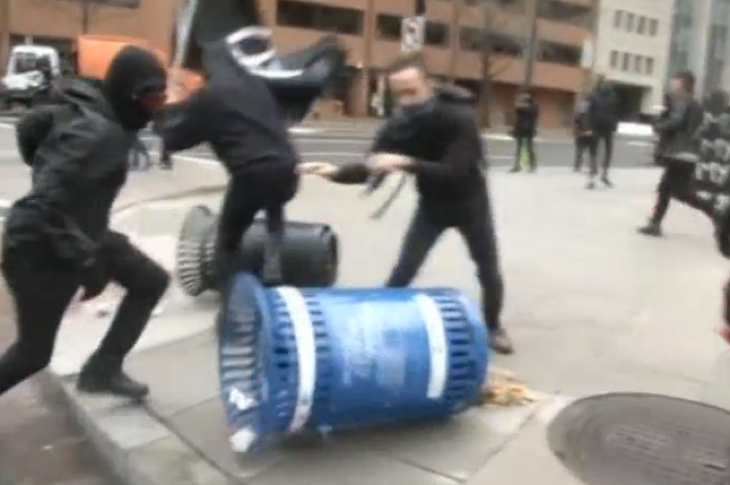 I just witnessed an anti-Donald Trump protest, and it was nasty. About an hour ago, I looked out the window on the corner of 13th and Massachusetts Avenue and saw a crowd of roughly 300 people — most of them dressed in black and wearing bandanas and hoods — moving quickly through the street. There were loud chants of ‘Fuck Donald Trump’. I walked out onto 13th Massachusetts Avenue and followed the noise down 13th towards Franklin Square. Suddenly it was chaos. There were some loud bangs. People and policemen were running in all directions. I could see lots of smoke which turned out to be tear gas. The bangs, I discovered, were caused by hoodies throwing bricks and rocks at windows. On the corner of Franklin Square, they smashed up a Starbucks and a Bank of America building. I spoke to a woman who said they surrounded the shop and started throwing things. ‘We thought we were being shot at, that they were going to shoot us,’ she said. ‘This was a hate group.’