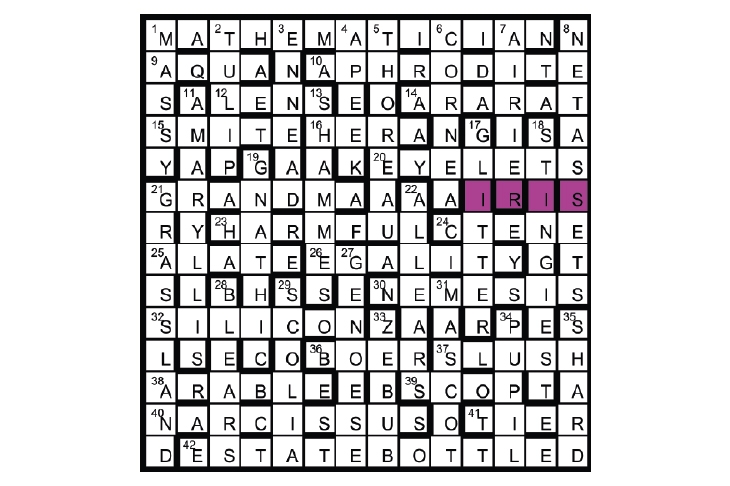 Unclued lights associated with IRIS are: flowers (2, 11, 40), Greek goddesses (10, 16, 30), and parts of the eye (6, 12, 34).