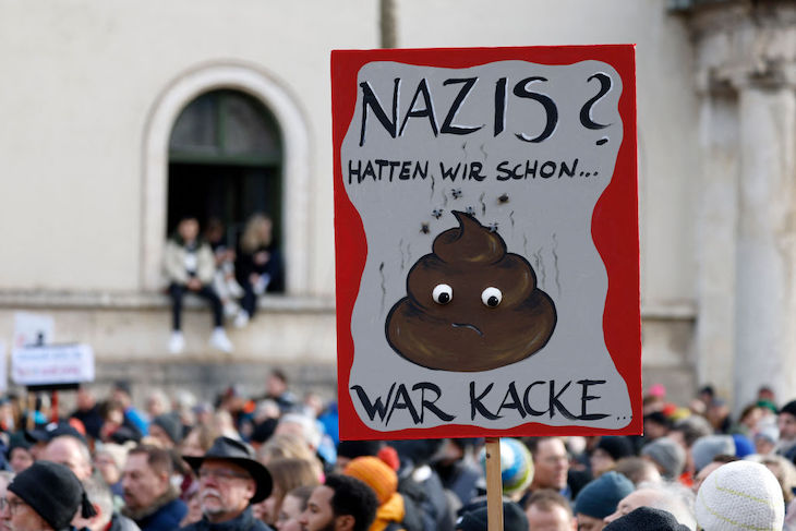 A protestor in Berlin holds up a placard with the lettering 'Nazis? We had that' (Getty)